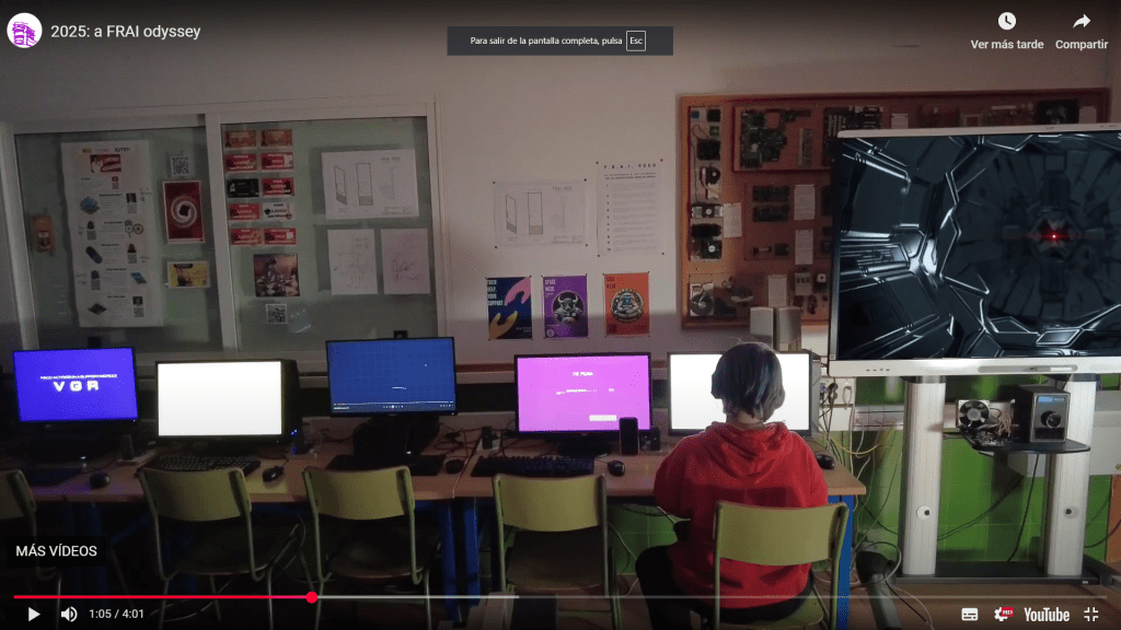 La cámara mantiene un plano medio estático desde atrás de un estudiante sentado frente a una fila de ordenadores. Todas las pantallas muestran colores distintos, sugiriendo pruebas técnicas o un sistema con fallos. El estudiante, con una sudadera roja, permanece inmóvil, concentrado en los monitores iluminados en blanco frente a él. A la derecha, una pantalla grande muestra una interfaz futurista con un detalle rojo en forma de ojo, evocando a HAL 9000. El espacio está rodeado de carteles, placas y esquemas tecnológicos—es una sala donde se estudian las máquinas, y quizás donde ellas empiezan a observar también.